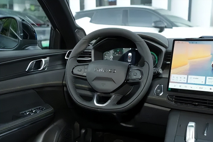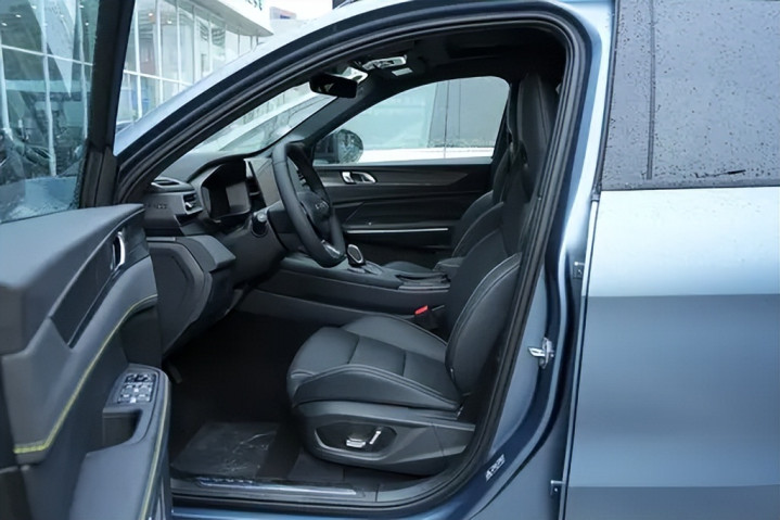 中控台设计体现出理性与高级感的平衡。上方采用大面积软质材料包覆,触感细腻,下方辅以金属拉丝饰条与翻毛皮拼接,提升了视觉层次。车门内饰与仪表台材质保持一致,整体触感与观感均优于同级竞品。方向盘握感饱满,粗细适中,按键布局合理。换挡机构采用短小精致的电子档杆设计,操作顺手。