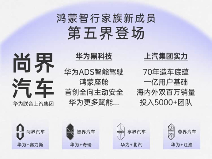 4月中旬,鸿蒙智行“第五界”重磅官宣——上汽集团联手华为打造的“SAIC尚界”横空出世。不到3个月时间,尚界首款SUV车型的首发概念海报就正式发布。作为鸿蒙智行的最后一“界”,尚界不仅自带流量光环,更有着华为、上汽、鸿蒙智行四“界”的Buff叠加,产品实力无需多言。借着尚界车型首度官宣的契机,我们不妨一起来探究一番,它的市场前景如何?